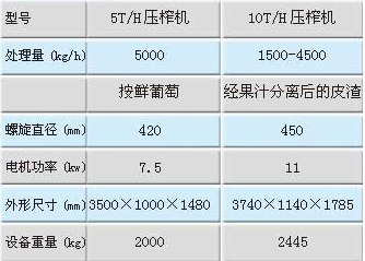 壓榨機為雙螺旋,螺旋方向相反,對物料的壓榨力大而均勻,出渣口錐形體由夜壓缸,調節油壓可改變對物料的施壓效果,調整出汁率,其效果因物料不同會有一定差別。與物料接觸部分采用不銹鋼制造。5噸/時壓榨機為雙螺旋轉,旋轉方向相反,對物料的壓榨力大而均勻,出渣口錐形體由液壓缸控制,調節油壓可改變對物料的施壓效果,調整出汁率,本機還可用于其它物料的固液分離,其效果因物料品質不同有一定的差別。與物料接觸部位采用不銹鋼制造。10噸/時壓榨機為低速螺旋間隙傳動,從而在壓榨過程中具有靜態提汁和動態提汁的雙重效果。采用調節油壓調節出渣壓板對皮渣的施壓取汁,保證果汁的質量和出汁率。
